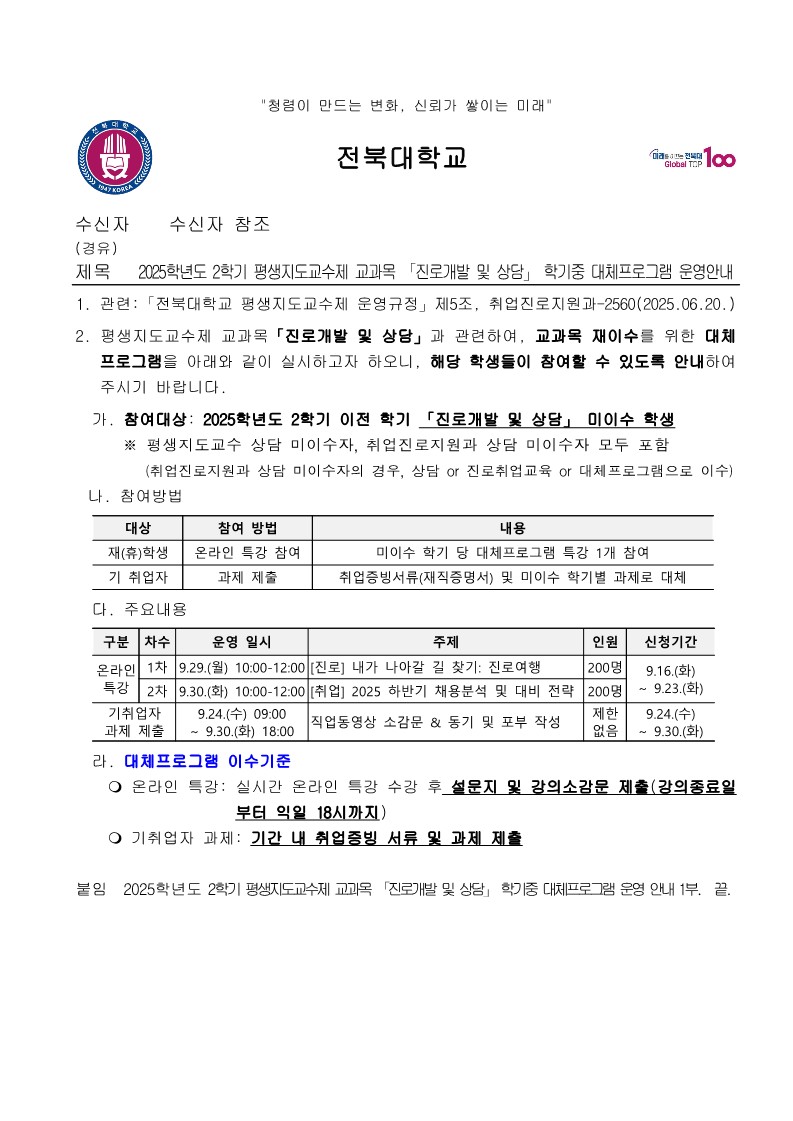 fnctId=bbs,fnctNo=411 작성일 2025.09.17 수정일 2025.09.17 작성자 동물자원과학과 조회수 82 [학사] 2025학년도 2학기 평생지도교수제 교과목 「진로개발 및 상담」 학기중 대체프로그램 운영 첨부파일 2025학년도 2학기 평생지도교수제 진로개발및상담 학기중 대체프로그램 운영 안내.hwp