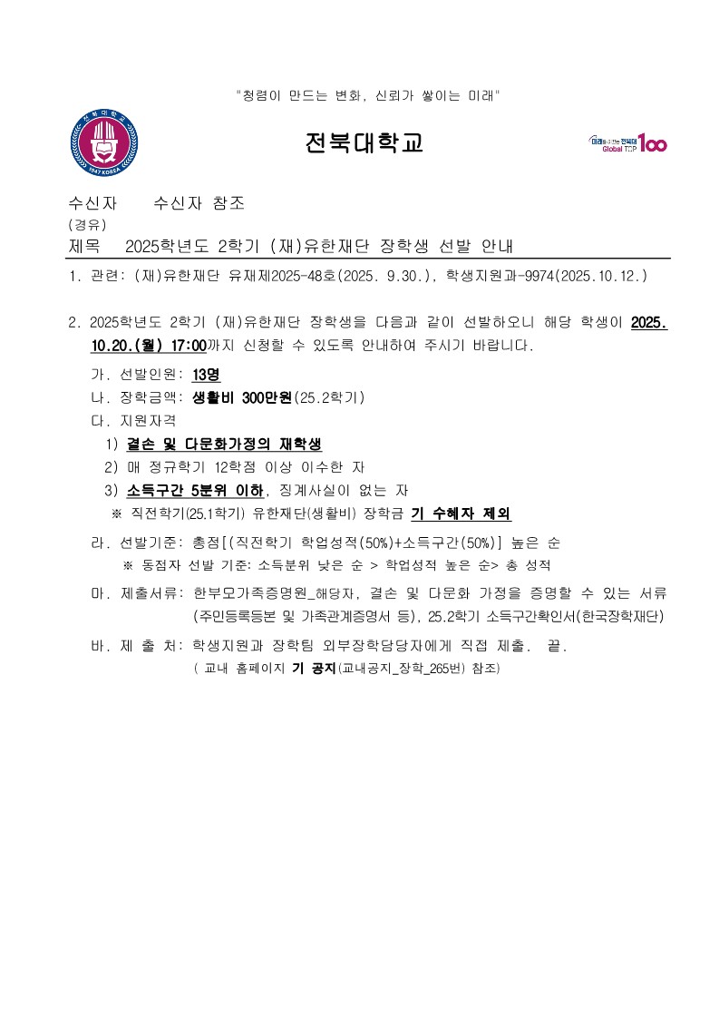 fnctId=bbs,fnctNo=411 작성일 2025.10.16 수정일 2025.10.16 작성자 동물자원과학과 조회수 7 [장학] 2025학년도 2학기 (재)유한재단 장학생 선발 안내 첨부파일 2025학년도 2학기 (재)유한재단 장학생(생활비) 선발기준(안).hwp